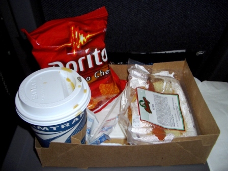 アムトラック内で朝食。ホットドック+コーヒー+ドリトス♪ |